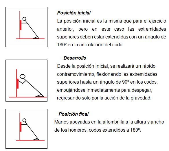 El atleta debe despegar a máxima velocidad de la alfombrilla fijada en el plano vertical, empujándose con las manos, después de realizar un rápido contramovimiento, y regresará nuevamente a esta posición por la acción de la gravedad.