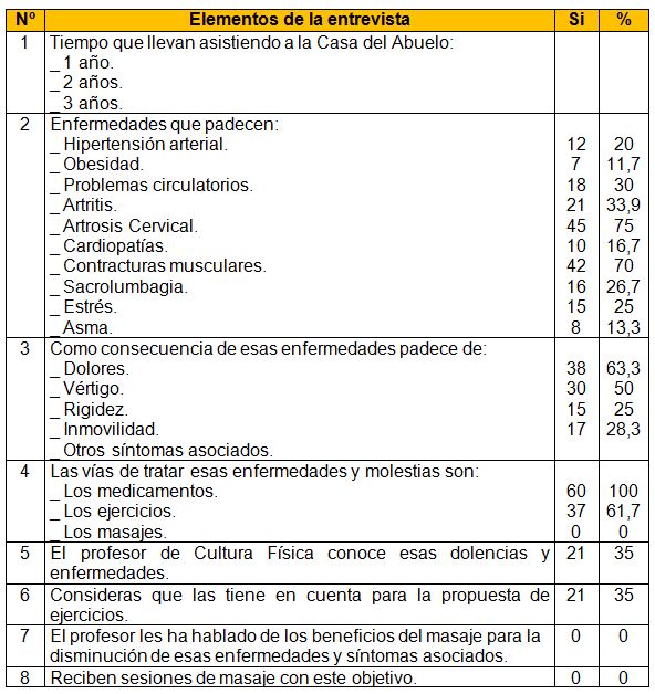En el análisis de las acciones concebidas en el trabajo con el adulto mayor, se manifiesta que solo el 35% tiene en cuenta esas enfermedades y síntomas asociados para la propuesta de actividades, que el 100% de los profesores proponen ejercicios en las actividades con el adulto mayor, por lo que ninguno sugiere masajes. Además, ningún adulto declara que el profesor les ha hablado de los beneficios del masaje para la disminución de esas enfermedades y síntomas asociados y que no reciben sesiones de masaje con este objetivo, ni orientaciones posturales para la casa y centro de trabajo, ni educación del adulto, lo que evidencia pobreza en la propuesta de actividades y que un número significativo de adultos continua teniendo dolores y afecciones cervicales.