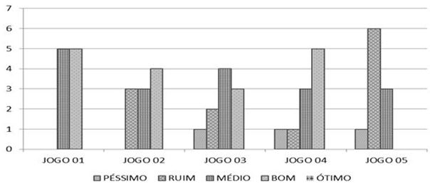 No jogo 2, nota-se uma redução na percepção do desempenho dos atletas, os quais classificam 03 (três) como desempenho ruim, 03 (três) enquanto desempenho médio e 04 (quatro) com desempenho bom. Gradativamente estes valores vão se expandindo entre as variáveis, conforme cada competição. Já no jogo 3 percebe-se que 01 (um) classifica seu desempenho como péssimo, 02 (dois) enquanto desempenho ruim, 04 (quatro) caracterizam seu desempenho como médio e 03 (três) como desempenho bom. Em relação aos jogos 4 e 5, a variabilidade das respostas tendem a aumentar para valores positivos, indicando maior contentamento dos atletas com o próprio desempenho na medida em que a competição avança.