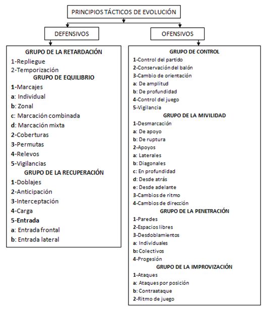 Son múltiples las clasificaciones expuestas por autores acerca de los principios de juego en el fútbol once. Al respecto, el autor de la presente investigación asume la clasificación de Contreras Romero (1998-2002) tomado de su artículo denominado Principios Tácticos del Fútbol.