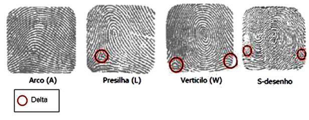 El arco (A) no presenta deltas, la presilla (L) presenta una delta y el verticilo (W) presenta dos deltas igual que el diseño S (Abramova, 1996).