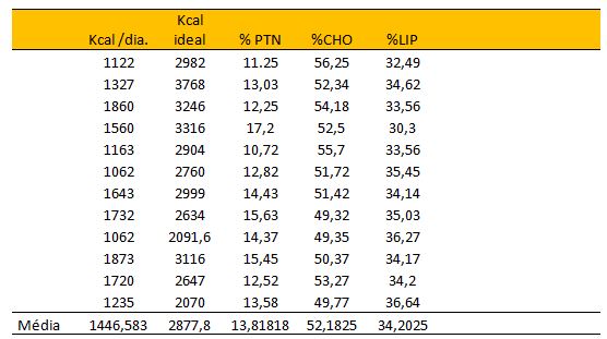Os atletas participantes do estudo apresentaram os seguintes resultados nutricionais:
