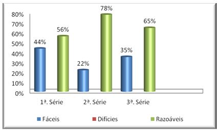 De acordo com os resultados analisados na 1ª série 44% relataram que as questões são fáceis e 56% acusaram que são razoáveis. Já na 2ª série 22% dos alunos responderam que as questões são fáceis e 78% razoáveis. Na 3ª série 35% relataram que são fáceis; 65% dos alunos responderam que são razoáveis. Como podemos verificar, nenhum aluno do ensino médio considera difíceis as questões que contém no Currículo de Educação Física.