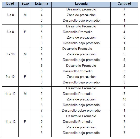 Finalmente, vale destacar del estudio de Moreno (2001) que el índice DIDEFI promedio de los varones fue de 4.20 y el de las hembras de 4.07 en la zona de precaución; en tanto que en este trabajo, dicho índice se dio en dos categorías de la puntuación estanina en varones de 4.27 en la zona de precaución y la otra alcanzó 5.14 en desarrollo promedio y, en las hembras fue de 4.28 en la zona de precaución.