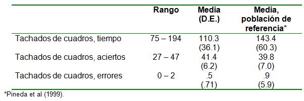 Tachado de cuadros: El tachado de cuadros es una prueba similar al Tolouse Pieron (Pineda et al., 1999) y evalúa atención sostenida con estimulación no verbal; consiste en presentarle al evaluado una matriz de 140 cuadrados con una línea colocada en diferentes posiciones, en uno de los lados o ángulos de cada cuadro. El sujeto deberá tachar lo más rápido posible las figuras que fueran iguales a tres estímulos colocados en la parte superior de la hoja. Existe un ejemplo, y antes de realizar la prueba, el evaluador deberá cerciorarse de que el sujeto haya entendido las instrucciones. Se califica el número de aciertos (máximo 48), el número de errores por omisión, los errores por comisión y el tiempo.
