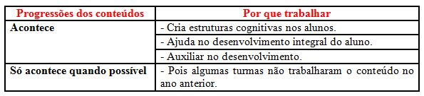 O professor representante dos 10%, cita que faz as progressões dos conteúdos quando possível, pois “algumas turmas não vivenciaram o conteúdo no ano anterior”, e por não terem a base acaba fazendo o resgate dos conteúdos. Espera-se no início de cada ano que o aluno tenha noção do conteúdo e cabe ao professor desenvolver os conteúdos estabelecidos para cada Ano, o resgate do conteúdo ou uma retomada, não é proibido, porem o professor tem que dar conta dos conteúdos básicos propostos pela Diretrizes Curriculares do Paraná do referente ano.A Diretrizes Curriculares do Paraná traz os conteúdo básicos divididos em uma Tabela para cada Ano, Paraná (2008) entende: