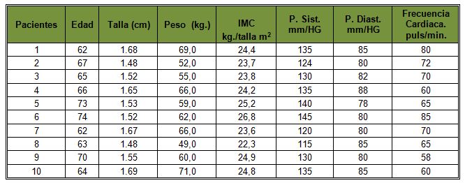 Para analizar el comportamiento del peso corporal de acuerdo a la talla de los pacientes utilizamos la tabla que evalúa el comportamiento del índice de masa corporal que ha sido establecida por el Ministerio de Salud Pública para la atención primaria de salud. Al realizar la primera medición, pudimos observar que los pacientes 1, 5, 6, 9 y 10 presentaban sobrepeso ligero grado I (según índice de masa corporal para adulto: peso corporal correspondiente a un valor específico de IMC, para una talla dada), al caer en el intervalo B con valores comprendidos entre 25,0 a 29,9, mientras que los sujetos 2, 3, 4, 7 y 8 estaban en un rango normal para un individuo al encontrase en el intervalo A con valores comprendidos entre 18,5 a 24,9 de IMC. Todos los pacientes presentaban hipertensión arterial grado I al efectuarse la primera medición, siendo los números 5 y 6 los que poseían las cifras mas elevadas de presión sistólica, mientras que los pacientes 2 y 8 eran los que tenían las cifras de presión diástolica más elevadas. Los casos 7 y 8 presentaban presiones sistólicas normal y óptima pero los valores de presiones diastólicas se encontraban entre 90 y 95mm/HG para una clasificación de HTA grado I. Los pacientes 5, 6 y 9 tenían Hipertensión Sistólica Aislada (HTAS), esto ocurre cuando la presión arterial sistólica es ≥ 140 y la presión arterial diastólica < de 90 mmHg, durante años se consideró un proceso benigno y natural propio del envejecimiento y actualmente se sabe que la HTAS juega un importante rol como factor de riesgo cardiovascular, observándose que con el tratamiento antihipertensivo aparejado al ejercicio físico se obtiene una significativa reducción en la incidencia de accidentes cerebro vasculares al controlarse estas cifras.