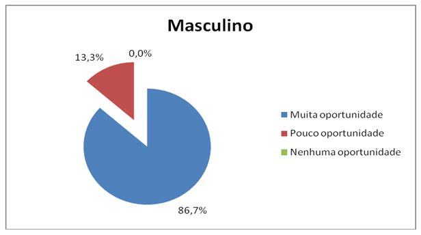 No gráfico que se refere em qual o grau de importância que você atribui às oportunidades que o estágio supervisionado pode oferecer para o aluno discutir e trocar experiências com outros profissionais da área, para o sexo masculino, 86,7% diz oferecer oportunidade, seguido de 13,3% afirmam pouca oportunidade e nenhum dos acadêmicos pesquisados afirmou nenhuma oportunidade. Seguido de 96,7% do sexo feminino diz oferecer oportunidade e 3,3% afirmam pouca oportunidade e nenhum dos acadêmicos pesquisados afirmou nenhuma oportunidade.
