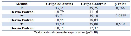 A média dos valores de preensão palmar para o grupo de atletas para mão direita foi de 43,82kgf (quilogramas-força) e para mão esquerda 42,31kgf. Ao comparar as médias de preensão palmar entre o grupo de atletas e o grupo controle não foram encontrados valores estatisticamente significativos (Tabela 2).