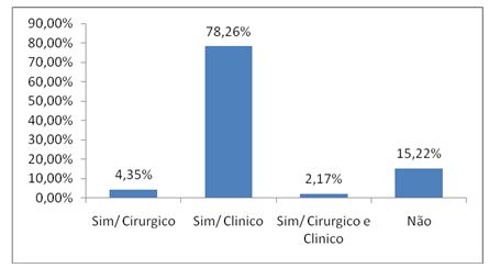 Com relação ao tipo de tratamento realizado pelos nadadores, a figura 5 apresenta o tipo de tratamento e se realizou ou não. Com relação a tratamento fisioterapeutico realizado após a lesão, observou-se que entre os atletas, 69,57% foram submetidos ao tratamento fisioterapeutico. Outro resultado importante e que deve ser observado, 69% dos atletas que responderam ao inquérito sofreram recidivas.