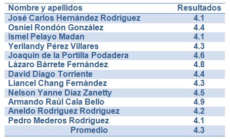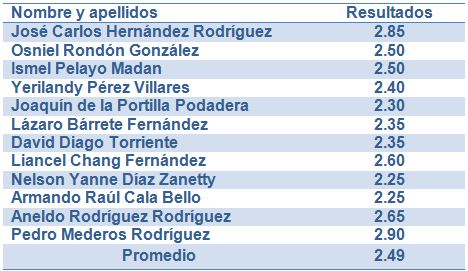 Los atletas que mejores se comportaron en la realización de este test fueron José Carlos Hernández Rodriguez y Pedro Eddy Mederos Rodriguez que fueron los que mejores resultados tuvieron en cada una de la pruebas, y que además Nelson Díaz Zanetty y armando cala bello fueron los de peores rendimientos en esta pruebas.
