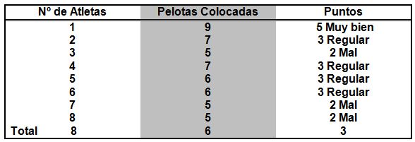 Un solo atleta obtuvo 5 puntos con una evaluación de muy bien, para un 12, 5%; las dificultades encontradas en este atleta fueron dos: posición inicial y en la empuñadura durante la ejecución del servicio.