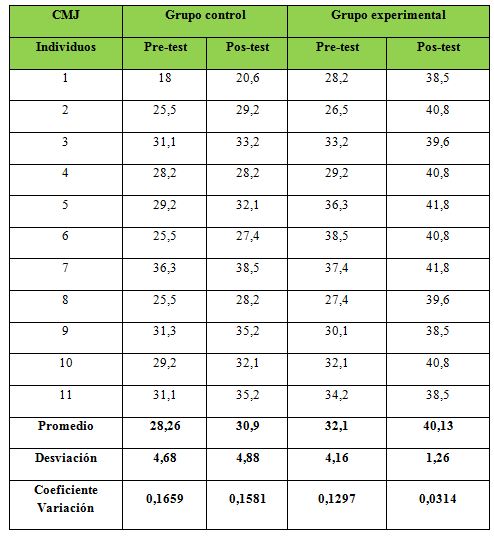 El valor del coeficiente de variación para el grupo control es de 0.1659 para el pre test (jugadoras ligeramente homogéneas) y de 0.1581 (ligeramente homogéneas) para el post test. El valor del coeficiente de variación para el grupo de Investigación es de 0.1297 para el pre test (jugadoras ligeramente homogéneas) y de 0.0314 para el post test (Jugadoras homogéneas), ya que su valor disminuyó al pasar del pre test al pos test, se puede afirmar que el programa de ejercicios pliométricos mejoró con respecto a CMJ e influyó favorablemente para generar homogeneidad en las jugadoras del grupo experimental.