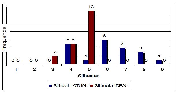 Com base no que diz Pinho et al. (1999), a adolescência representa um período importante no controle e na prevenção ao acúmulo excessivo de gordura corporal. No grupo feminino deste estudo identifica-se que a frequência de pessoas que se consideram obesas (silhuetas 7, 8 e 9) é proporcionalmente pequena, mas nenhuma delas está satisfeita com seu corpo atual, pois no teste nenhuma menina marcou na figura o mesmo número para atual e ideal. É possível também levar em consideração quase um consenso entre elas, pois a percepção da silhueta ideal foi maioria na de número 3.