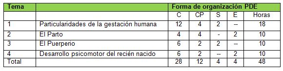 Evaluación y apreciaciones: Los usuarios que se integren al curso deberán vencer los objetivos del programa. La evaluación del aprendizaje durante el desarrollo del curso será de forma sistemática, mediante la participación en las actividades teóricas y prácticas La evaluación final consistirá en la en la fundamentación y presentación de una clase dirigida a una de las etapas del embarazo, defendida en un taller.