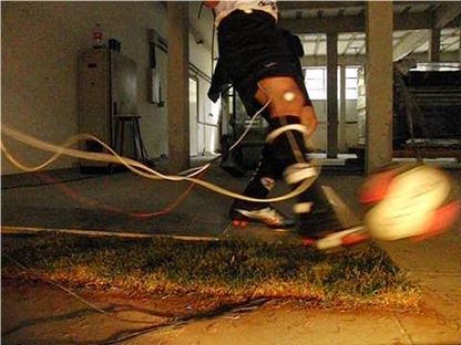 O chute é o fundamento do futebol onde o atleta visa, através da sua utilização, atingir a meta adversária, com o intuito de fazer o gol. Esse fundamento pode ser realizado utilizando-se várias partes do pé para realizar o contato com a bola. Lees e Nolan (1998), detectaram que o chute é a habilidade mais estudada no futebol, sendo que existem muitos tipos de chute, porém o que recebe maior atenção da comunidade científica é o chute com o dorso do pé realizado com velocidade máxima, estando a bola parada. O conhecimento teórico do chute é um fator importante para o jogador, pois o habilita a diminuir as possibilidades de erros. Deve ser desenvolvido ao máximo sob condições difíceis e com qualquer parte do pé. A execução técnica do chute é aparentemente fácil, porém na prática pode tornar-se difícil devido a condições externas que nem sempre são controláveis. O jogador define o método do chute de acordo com seu propósito imediato, mas às vezes, as circunstâncias da partida é que determinam o tipo e a força empregada para atingir o objetivo determinado no instante. É importante respeitar o estilo do jogador mostrando-lhe as possibilidades de melhoria do movimento. Embora a literatura apresentada em sua maior parte defina como chute de potência aquele executado com o dorso do pé, e chute colocado ou com precisão aquele executado com a parte interna do pé; existem diferentes maneiras de executar um chute com o dorso do pé, numa pesquisa desenvolvida por Silva (2012) desenvolveu um sistema de medição biomecânica utilizando parâmetros cinemáticos, tais como: cinemetria bidimensional e parâmetros cinéticos, tais como: dinamometria, representada pela força de reação do solo e aceleração tibial, o qual a fase experimental consistiu na execução pelos voluntários do chute com o dorso do pé visando um alvo a nove metros de distância, numa simulação de batida de falta sem barreira ou pênalti, aonde foi possível trabalhar o chute colocado ou preciso juntamente com a potência ou ganho maior em velocidade visando dificultar as ações defensivas do goleiro adversário. Segundo Barfield (1998), o chute continuará sendo um tópico que necessitará muita discussão e pesquisas no campo da biomecânica porque continuará a ter um grande número de situações não totalmente solucionadas. A primeira é a influência das forças no pé de apoio no jogador relacionada à velocidade da bola; a segunda é a divisão mais definitiva das forças e momentos do quadril e joelho; a terceira é a relativa contribuição de cada ação do chute no futebol; e a quarta é o desenvolvimento de mecanismos próprios para proteção contra possíveis lesões decorrentes do jogo. A figura 1 mostra um sistema desenvolvido para análise da técnica do chute feito em laboratório, os quais foram avaliados quantitativamente os parâmetros fundamentais de uma técnica de execução do chute bem desenvolvida; neste caso o voluntário executou o chute com o dorso do pé visando o alvo e a resposta dos parâmetros analisados foram coletadas, analisadas e interpretadas posteriormente, fornecendo uma ferramenta eficaz para ser aplicada tanto em pequenas como em grandes amostras, podendo servir para melhora da performance motora quanto para prevenção de lesões decorrentes do desporto.