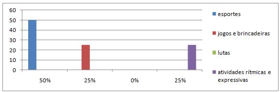 Sobre os conteúdos abordados nas aulas, os quatro professores tiveram, ao contrário das anteriores, respostas divergentes. Dos quatro professores entrevistados, 50% responderam que os conteúdos que dominam nas aulas são os esportes, 25% deles replicaram que os jogos prevalecem em suas aulas e 25% responderam que o que dominam as aulas de educação física são as atividades rítmicas e expressivas. Em contraposição, nenhum disse que as lutas estão enquadradas em suas aulas.