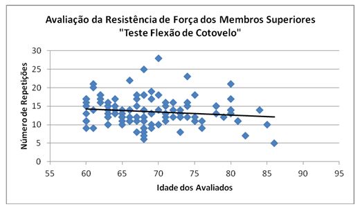 A média simples para os 119 avaliados foi de 13,5 repetições, e o desvio padrão foi de 3,7. Os resultados encontrados no presente estudo são semelhantes aos resultados encontrados por Pereira et al. (2009), que comparou os resultados do “Teste de Flexão de Cotovelo” em idosos sedentários e ativos, e encontrou para os idosos ativos 13 repetições como média.