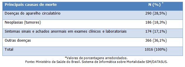 A primeira causa básica de morte foram as doenças do aparelho circulatório com 28,5%, seguido das neoplasias (tumores) representando 18,3% e em terceiro lugar aparece os sintomas sinais e achados anormais em exames clínicos e laboratoriais 17,1%. As outras doenças juntas somam 36,1% dos casos de óbitos.