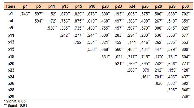 Tabela 5. Coeficientes de correlação inter-items na dimensão habilidades profissionais