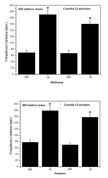 A Figura 4 apresenta os valores médios de freqüência cardíaca nas duas condições analisadas: corrida de 400 metros rasos (Homens: RP = 78±8 bpm, IA = 190±12 bpm, onde *p<0.001; Mulheres: RP = 69±8 bpm, IA = 190±15 bpm, onde *p<0.001); corrida de 12 minutos (Homens: RP = 69±5 bpm, IA = 159±6 bpm, onde *p<0.001; Mulheres: RP = 67±10 bpm, IA = 160±12 bpm, onde *p<0.001).