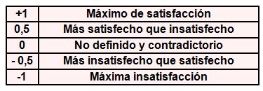 Para obtener el índice de satisfacción grupal (ISG) se trabaja con los diferentes niveles de satisfacción que se expresan en la escala numérica que oscila entre +1 y - 1 de la siguiente forma: