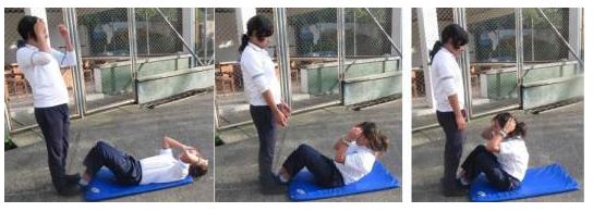Tendido supino (sobre la espalda), con piernas flexionadas y separadas a la anchura de los hombros, los brazos cruzados delante del tronco. Un compañero sujeta los pies.
