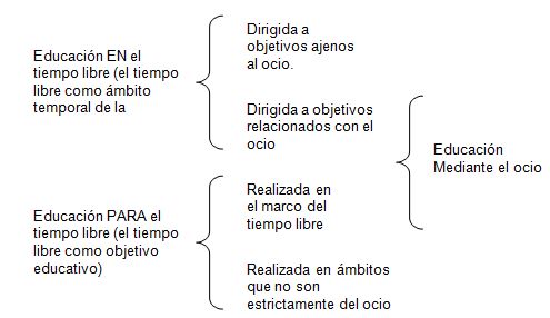 La pedagogía del ocio tiene la doble misión de educar en el tiempo libre y de educar para el tiempo libre (Puig y Trilla, 1987). La primera está referida al ámbito temporal en el que pueden realizarse actividades educativas, pero no necesariamente tienen que estar relacionadas con el ocio. En la segunda se pretende formar a la persona para que viva su ocio de la manera más provechosa, tarea que puede ser llevada tanto en el tiempo libre como fuera de él (por ejemplo en la escuela.) Ambos conceptos son diferentes aunque no con ello excluyentes, llegando a complementarse en la frase: educar en, para y mediante el ocio, que es a su vez como mejor puede expresarse el objeto de la pedagogía del ocio (esquema 1).