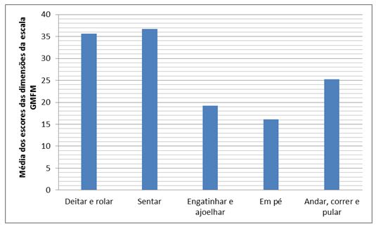 Ao avaliar se existe diferença entre as médias dos escores totais da escala GMFM pelo teste estatístico, análise de variância (ANOVA) considerando um p de 5% não foi observado diferença estatisticamente significante, com p = 0,1745. As médias e desvios-padrões dos escores da escala GMFM no parâmetro deitar e rolar foi de 35,62 ± 16,26, no parâmetro sentar foi de 36,75 ± 25,63, no engatinhar e ajoelhar foi de 19,25 ± 16,43, em pé de 16,12±15,78 e no parâmetro de andar, correr e pular foi de 25,25 ± 25,14. O gráfico 4 demonstra piores médias nos quesitos engatinhar, ajoelhar e ficar em pé.