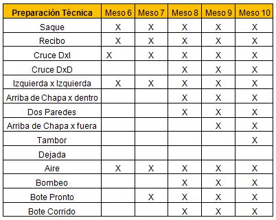 Temporalización recomendada dentro del Trinquete después del 5 mesociclo, teniendo ya los pelotaris vencidos los primeros 6 meses de acondicionamiento a largo tiempo por etapas