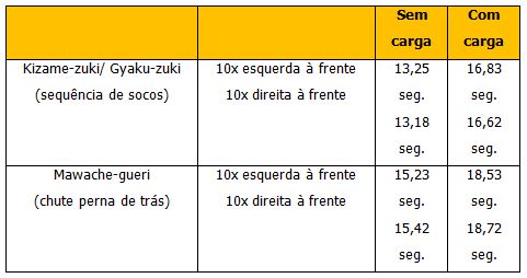de 24,27% no golpe kizame-zuki/gyaku-zuki e 21,45% no golpe mawache-gueri