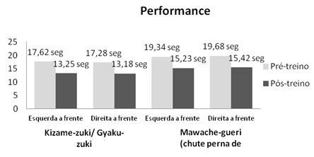 O gráfico 2 mostra os testes de agilidade realizados pré e pós treino mostrou que houve uma melhora de 29,25% no golpe kizame-zuki/gyaku-zuki e 26,56% no golpe mawache-gueri.