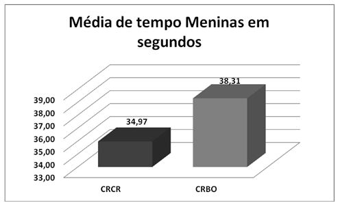 Figura 3. Média do tempo total (em segundos e centésimo de segundos) de nado nas condições CR/CR e CR/BO, em meninos e meninas