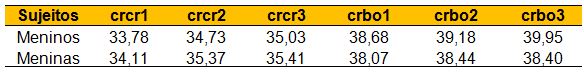 Na comparação entre grupos, pode-se observar, tanto pela Tabela 3, como pela FIGURA 3 que as tentativas de CR/CR foram melhores que as tentativas CR/BO, para os dois grupos (meninos e meninas) e que os meninos nas tentativas de CR/CR foram mais rápidos que as meninas, já nas tentativas de CR/BO, as meninas foram mais rápidas. Isso não foi confirmado pelo teste U de Mann Whitney, visto que não foi detectada diferença significativa entre os grupos (p>0,05), ou seja, os grupos tiveram desempenho equivalente uns com os outros, em todas as condições e tentativas.