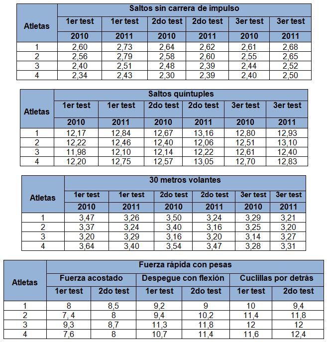 En los test aplicado para evaluar la fuerza explosiva durante los años 2010 y 2011 se pudo observar que dos atletas disminuyen los resultados de un año a otro (1 y 3).