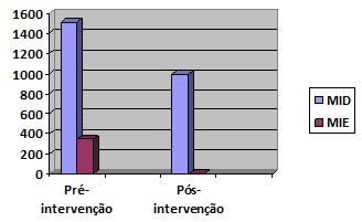 As médias dos picos de pressão podem ser visualizadas no gráfico (g/cm²), figura 3, onde são observados diferentes médias nos picos de pressão no MID e MIE pré e pós-intervenção fisioterapêutica, sendo menores MIE pós-intervenção enquanto se mantiveram estáveis no MID.