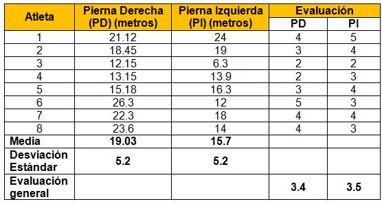 Algo más notorio ocurre con la atleta número tres donde solo llega a alcanzar una distancia de 12.15 metros con su pierna más hábil (la derecha) que en este caso está evaluada con dos puntos.