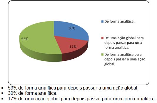 A maioria dos professores (53%) afirma que durante a fase de aquisição do elemento de forma rudimentar os fundamentos devem ser treinados de forma analítica para depois passar a uma ação global.