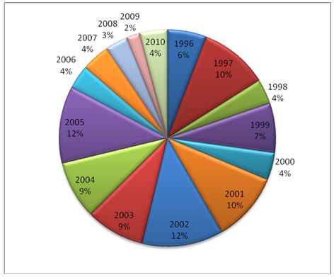 Gráfico 1. Exames realizados no período de 1996 a 2010, com os resultados em forma de porcentagem