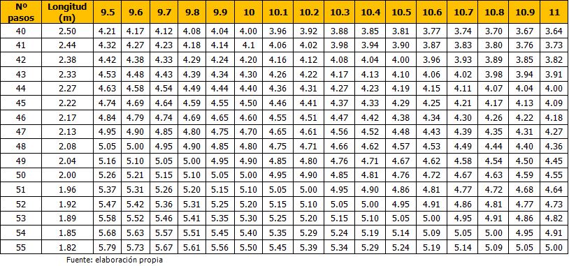 Para facilitar el cálculo de los entrenadores de la zancada de sus atletas en 100 metros hemos diseñado una tabla 1 de referencia con el número de pasos en la carrera, donde se determina la longitud (m) y por el tiempo (segundos), la correspondiente frecuencia de pasos por segundo. La tabla 1 tiene otra posibilidad como el delimitar la base para el cálculo de los incrementos de la mejora de la velocidad con valores de los parámetros de longitud y frecuencia de la carrera de los 100 metros.