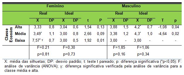 Na tabela 4 comparando os valores absolutos da imagem real e ideal entre as classes sócio econômicas, sendo notado para a ANOVA que percepção real a classe baixa para o sexo feminino diferiu significativamente das demais classificações. Foi também observado nas meninas que houve diferença da percepção real da ideal para as classes média e baixa. Para os meninos a imagem real foi significativamente inferior a ideal nas classes alta e média.
