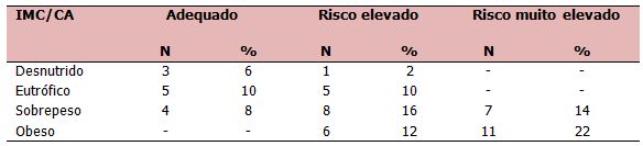 Em relação à classificação do IMC pôde-se verificar que 8% (n=4) dos taxistas apresentaram desnutrição, 20% (n=10) eram eutróficos, 38% (n=19) tinham sobrepeso e 34% (n=14) dos participantes apresentaram obesidade.