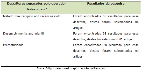 O levantamento bibliográfico de publicações indexadas ou catalogadas foi realizado no período de Abril a Maio de 2012, nas bases de dados da Scientific Electronic Library Online (SCIELO), Medical Literature Analyses and retrieval sistem online (MEDLINE), Literatura latino americana em ciências da saúde (LILACS). Estes são bancos de dados cujo acesso pode ser feito “online” através da Biblioteca Virtual em Saúde (BVS). As palavras chave utilizadas foram, respectivamente: método mãe canguru, desenvolvimento infantil e prematuro.