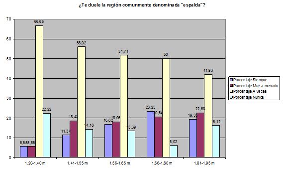 El 51,88 % del total de alumnos encuestados responde que “a veces” les duele la espalda; el 17,81 % “siempre”; el 18,85 % “muy a menudo” y solo el 11,44 % responde que “nunca”.