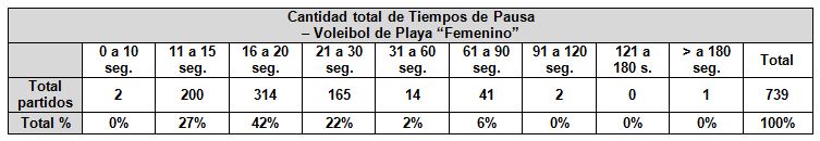 Cuadro 4. Duraciones de los tiempos de pausa en el voleibol de playa “femenino”. Andrés Esper, 2013