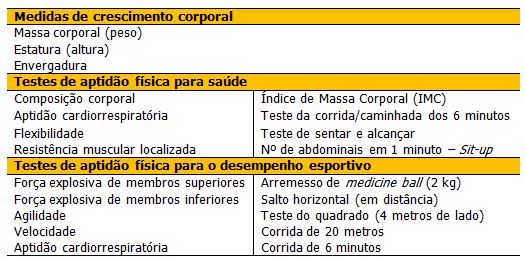 Os testes correspondentes às avaliações físicas dos alunos foram realizados nos períodos das aulas de educação física no primeiro semestre de 2013. Para a coleta dos dados foi utilizado o protocolo de testes do Projeto Esporte Brasil (PROESP, 2012), o qual é composto das avaliações citadas abaixo na tabela 1:
