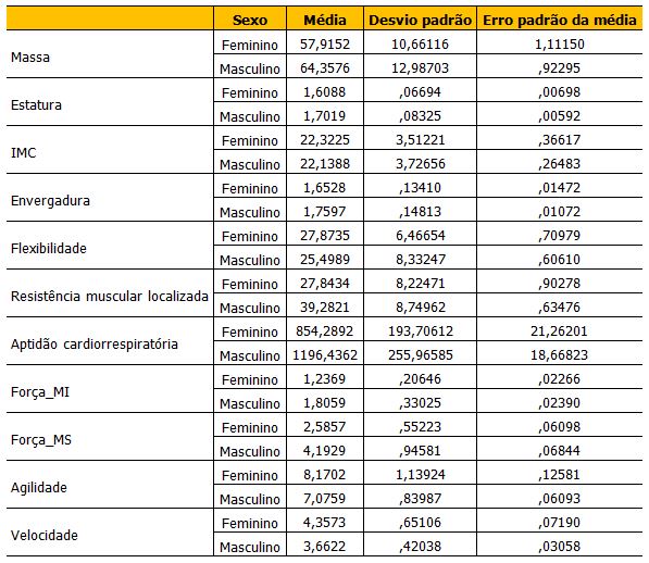 Ao ser realizado uma análise independente da idade foi verificado que a média de massa foi prevalente no sexo masculino, assim como estatura, envergadura, resistência muscular localizada, aptidão cardiorrespiratória, força MI e MS. Entretanto no sexo feminino apresentou maiores médias no IMC, flexibilidade, agilidade e velocidade (tabela 2).
