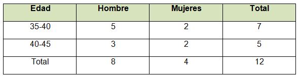 La muestra es de 12 personas, de ellos son 4 mujeres y 8 hombres, la asistencia se ha comportado por encima del 90 %, en el caso de la pregunta número 3 donde se refiere a que si desearían realizar ejercicios físicos el 100% plantean que si y en el caso de la pregunta 4 de que con que frecuencia desean realizar ejercicios físicos de ellos 8 plantean que 4 veces por semanas para un 66%,los mismos se realizan en un local bajo techo de carácter particular en la comunidad, durante 45 minutos, a la misma se incorporaron principiantes que no forman parte de la muestra, durante los dos meses que lleva de aplicación se han sumado 15 personas de diferentes edades.
