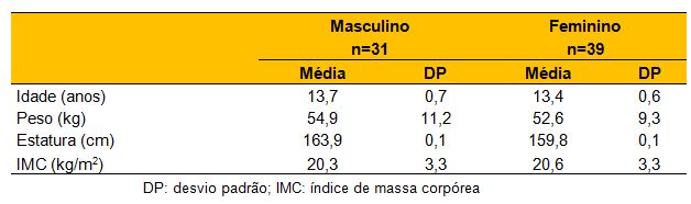 A amostra foi composta por 70 alunos, com idade entre 13 a 15 anos, sendo 31 do sexo masculino e 39 do sexo feminino, conforme podemos ver na Tabela 1.
