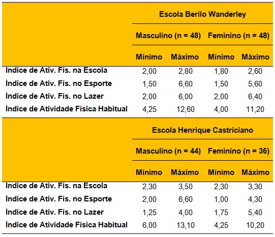 Tabela 02. Valores mínimos e máximos das variáveis envolvidas na avaliação do Índice de Atividade Física Habitual separados por unidade de ensino